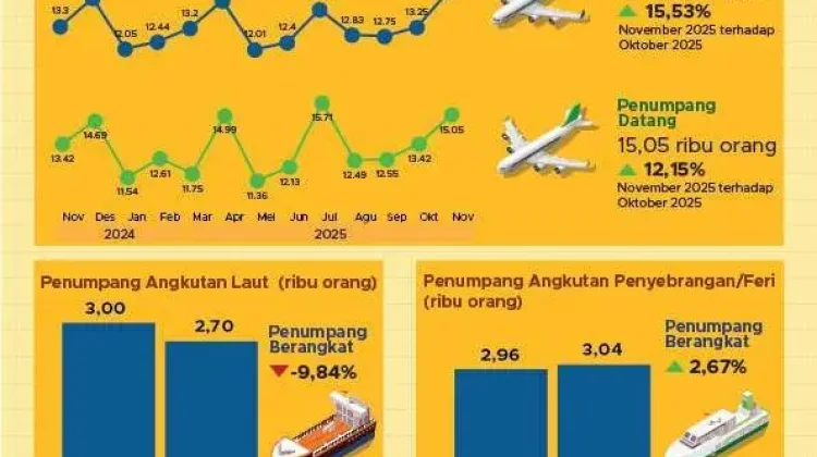 Jumlah penumpang datang meningkat 12,15 persen, yaitu dari 13.417 orang pada Oktober 2025 menjadi 15.047 orang pada November 2025.