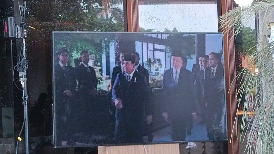 Presiden Prabowo dan Jokowi, duduk di sisi kanan dan kiri meja tempat berlangsungnya akad nikah. Keduanya nampak mengenakan setelan jas beserta kopiah.