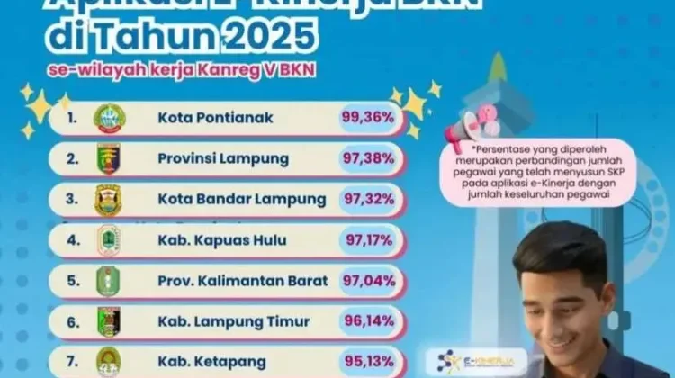 KBRN, Pontianak: Pemerintah Kota Pontianak mencatatkan prestasi membanggakan dengan menempati peringkat pertama dalam 10 Instansi Tertinggi Pemanfaatan Aplikasi E-Kinerja BKN Tahun 2025 di wilayah kerja Kantor Regional V Badan Kepegawaian Negara (BKN). Kota Pontianak meraih capaian tertinggi dengan persentase 99,36 persen.