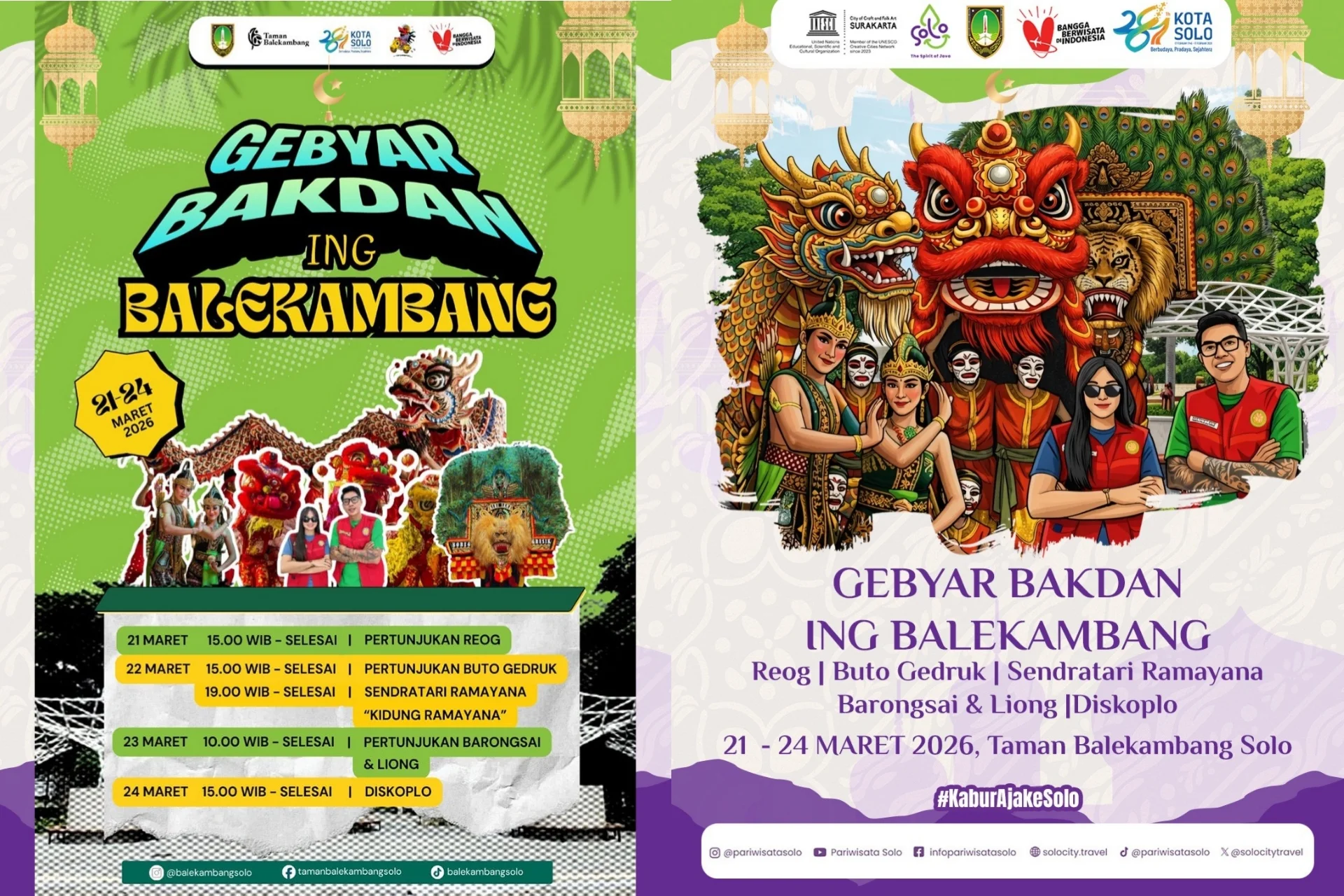 Rangkaian acara kemudian ditutup pada Selasa, 24 Maret 2026, dengan hiburan musik Diskoplo yang siap menghidupkan suasana di Amphitheater mulai pukul 15.00 WIB Ini sekaligus menjadi penutup meriah dalam perayaan Gebyar Bakdan ing Balekambang 2026.
